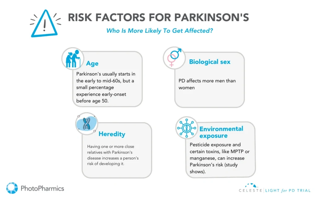 Aging is the most significant risk factor. Most diagnoses occur after age 60, though early-onset Parkinson’s can appear in younger individuals.