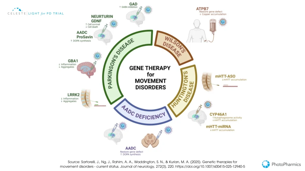 Dopamine Replacement Strategies: Some gene therapies aim to help the brain produce more dopamine by delivering genes like AADC (which converts levodopa to dopamine) or a combination of genes needed for dopamine synthesis (e.g., ProSavin, AXO-Lenti-PD).