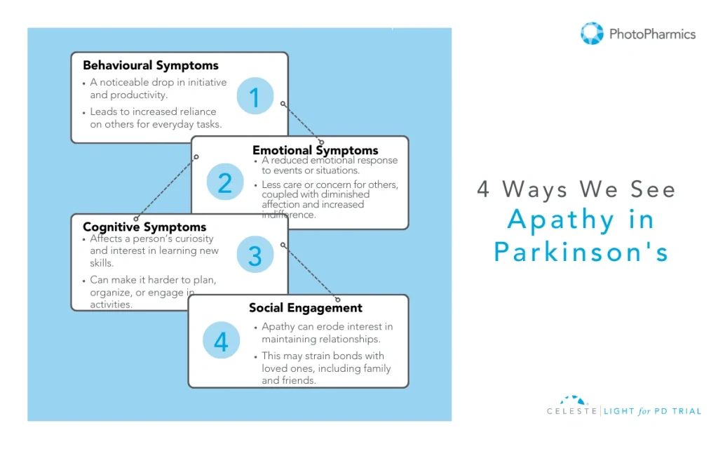 - Apathy: A lack of motivation that may be mistaken for intentional behavior but stems from neurological changes. It can significantly impact not only the person living with PD but also their loved ones. Apathy manifests in three ways: